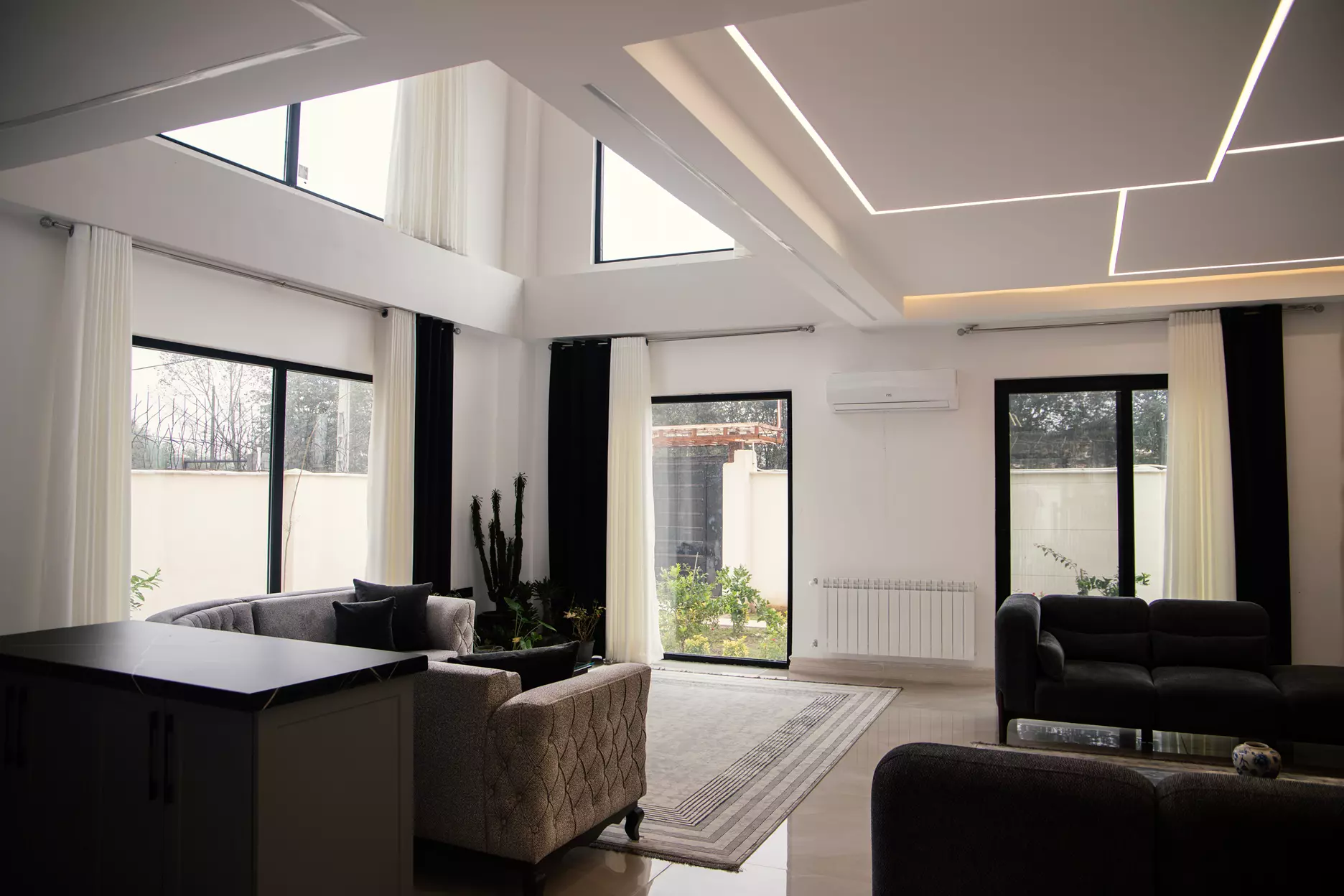 در طراحی این پروژه تأکید اصلی بر ترکیب زیبایی مینیمال با کارایی مهندسیشده بوده است؛ جایی که قابهای باریک و رنگ تیرهی فریمها، نورگیری طبیعی فضا را برجسته کرده و مرز میان فضای داخلی گرم و منظر سبز بیرون را از بین برده است. نتیجهی این رویکرد، ایجاد محیطی آرام، لوکس و در عین حال پایدار از نظر انرژی است.